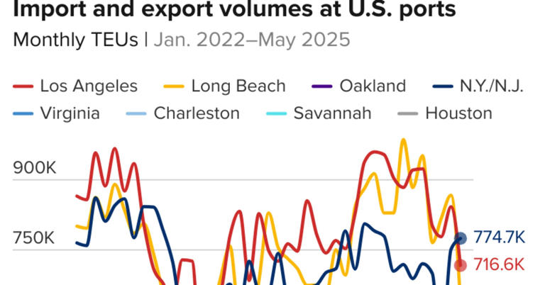 وقالت بيثان روني، مديرة ميناء نيويورك ونيوجيرسي، لشبكة CNBC: “من المؤكد أن الرسوم الجمركية لن تؤثر علينا بقدر تأثيرها على الساحل الغربي، لأننا لا نعتمد على الصين بقدر اعتماد نظرائنا في الساحل الغربي”. “لقد شهدنا بالفعل زيادة في حجم الصادرات من أوروبا وجنوب شرق آسيا والهند وفيتنام. لا أتوقع ارتفاعًا ملحوظًا في يوليو، ولكننا سنشهد أحجامًا قوية”.
