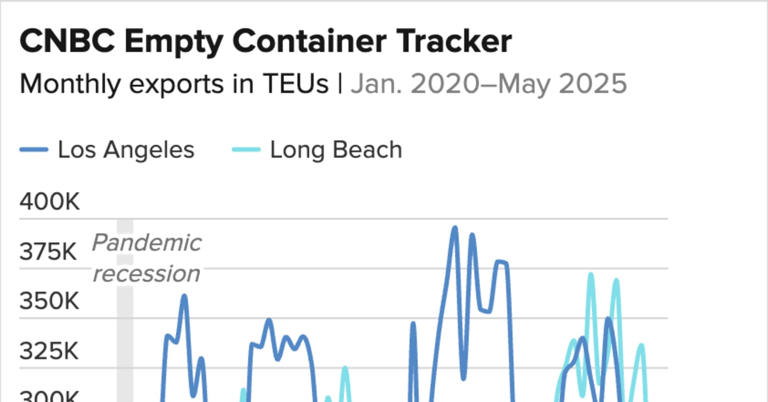 ويُظهر تحليل CNBC للحاويات الفارغة عدم وجود اندفاع للحاويات الفارغة التي تغادر موانئ لوس أنجلوس ولونغ بيتش للعودة لإعادة تعبئتها.