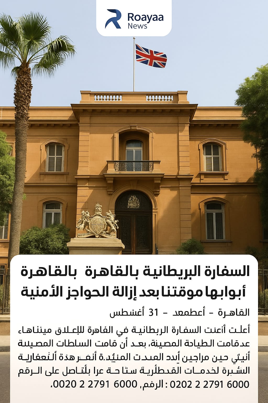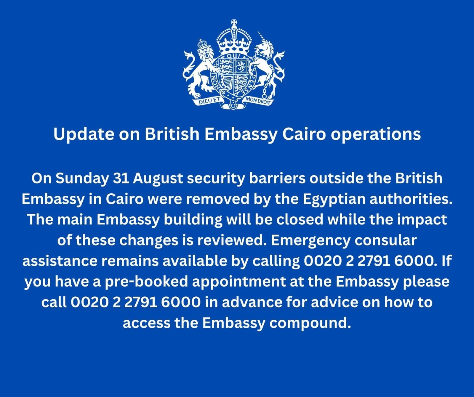 أعلنت السفارة البريطانية في القاهرة عن إغلاق مبناها الرئيسي مؤقتًا، بعد أن قامت السلطات المصرية بإزالة الحواجز الأمنية المحيطة بالسفارة يوم الأحد 31 أغسطس.