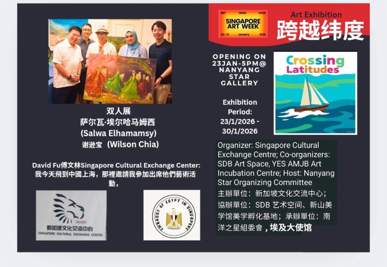 ويشهد المعرض مشاركة الفنانة المصرية سلوى الحمامصي في معرض ثنائي يجمعها بالفنان السنغافوري ويلسون شيا، ويقام في مركز نانيانغ ستار للفنون خلال الفترة من 23 إلى 30 يناير 2026. ويقدّم المعرض حوارًا بصريًا بين التجربة الفنية المصرية ذات الجذور الحضارية العميقة، والمشهد الفني السنغافوري المعاصر، في إطار يعكس تلاقي الثقافات وتجاوز الحدود الجغرافية.